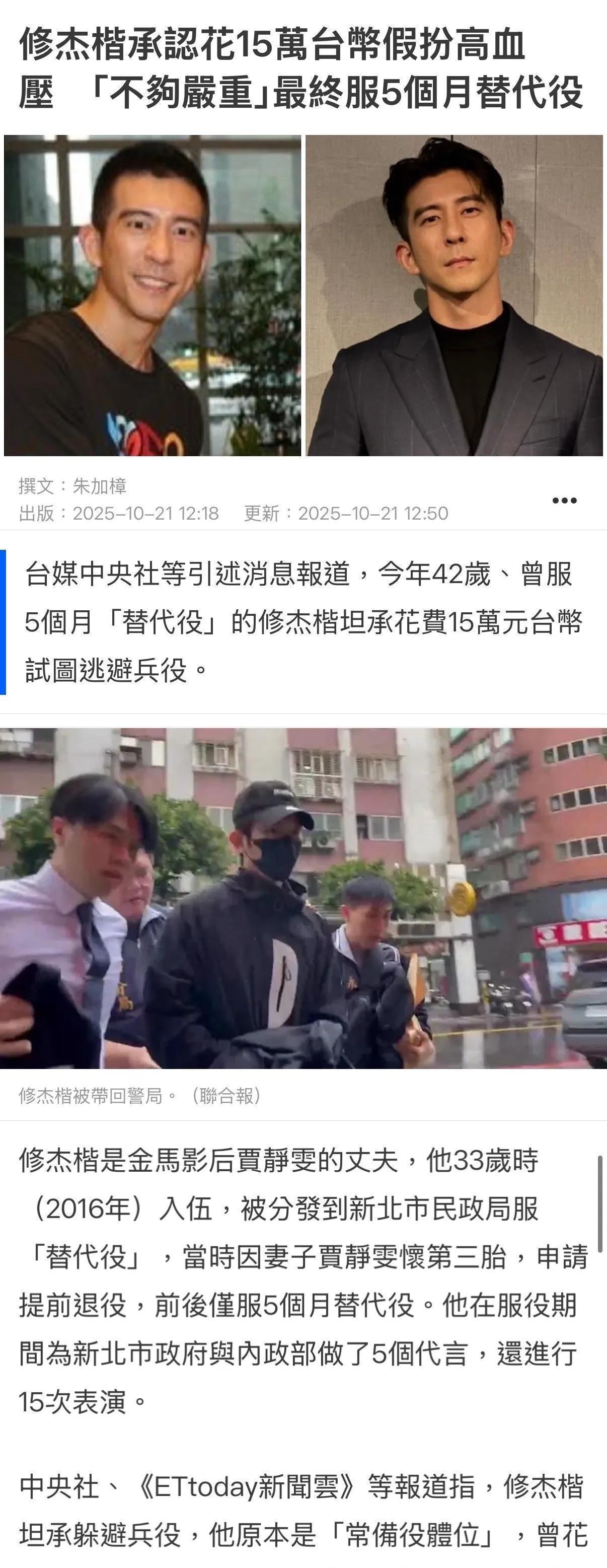 陈柏霖交代逃兵役的细节后,贾静雯老公修杰楷也承认了。修杰楷透露他花费了15万台币,以高血压症为理由逃避兵役,本来想申请免役没有通过,最后服了5个月的替代役。申请退役后,修杰楷连续接了5个代言,参加了十多场活动,没有看到任何的身体不适,高血压症或只是借口而已。