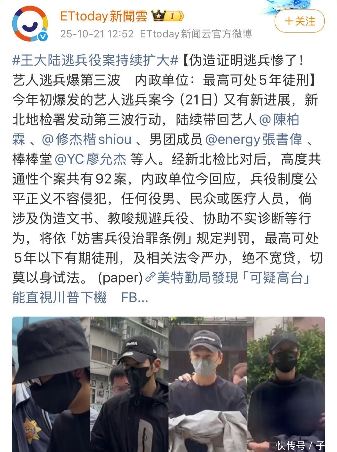 面临台湾省大量艺人逃兵役一事,有关部门给出了最新的回应,最高可处罚5年有期徒刑,可能不仅是罚款或是重新服兵役那么简单。